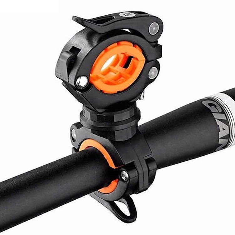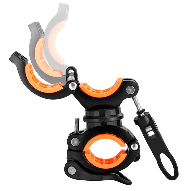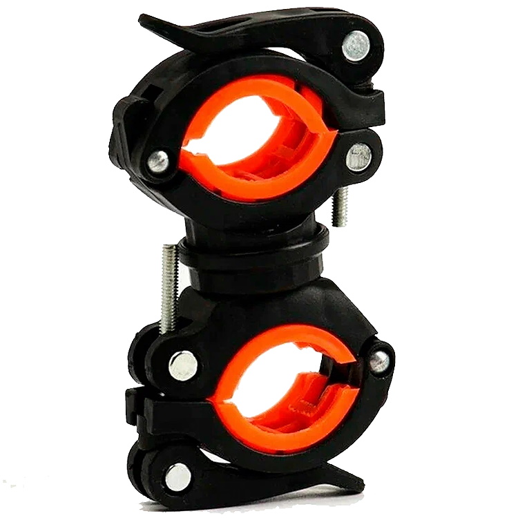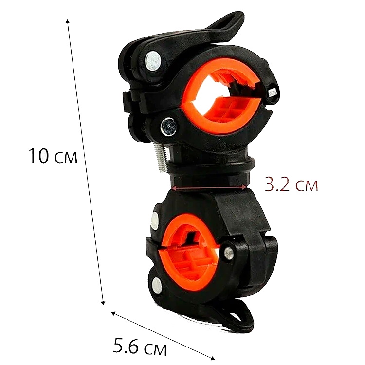 Держатель имеет два поворотных независимых захватов. Один захват закрепляется на трубе руля/седла или другой трубе велосипеда. В другой захват закрепляется фонарь, насос или другой аксессуар. поворотный механизм для поворота на 360 градусов. Закрепление и ослабление вручную без помощи инструмента. Силиконовые уплотнительные пластины в количестве 4 штук + 2 дополнительные (ставятся на захват, который устанавливается на руль, чтобы не царапать краску и для уплотнения). Диаметр удерживаемого фонаря 1,8 - 3,8 см. материал - пластик, жёсткий силикон размеры - 10 х 5,6 х 3,2 см. вес - 82 г.