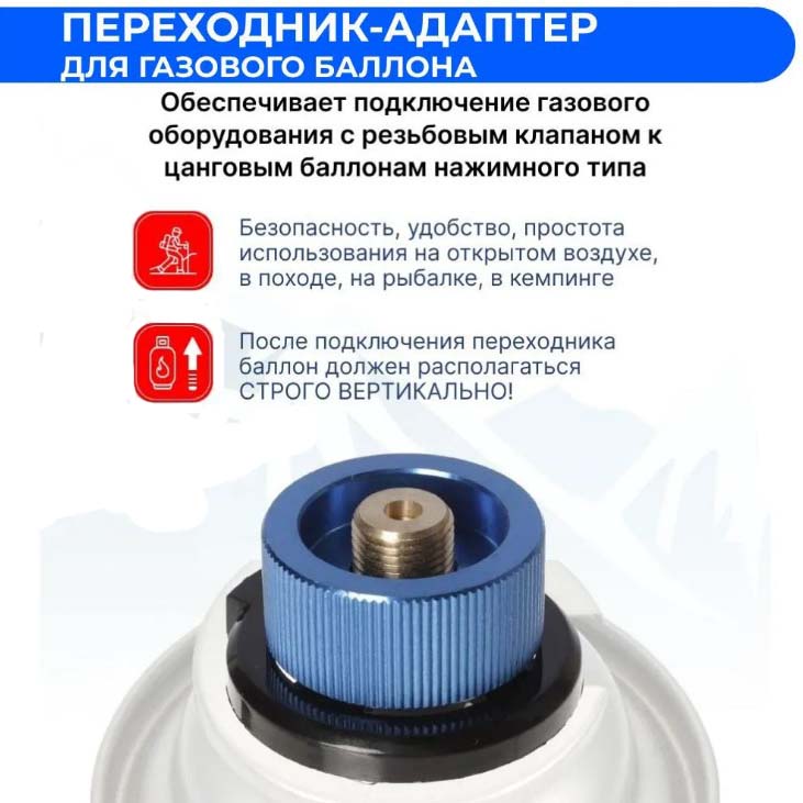 После подключения переходник для газового баллона должен располагаться строго вертикально.