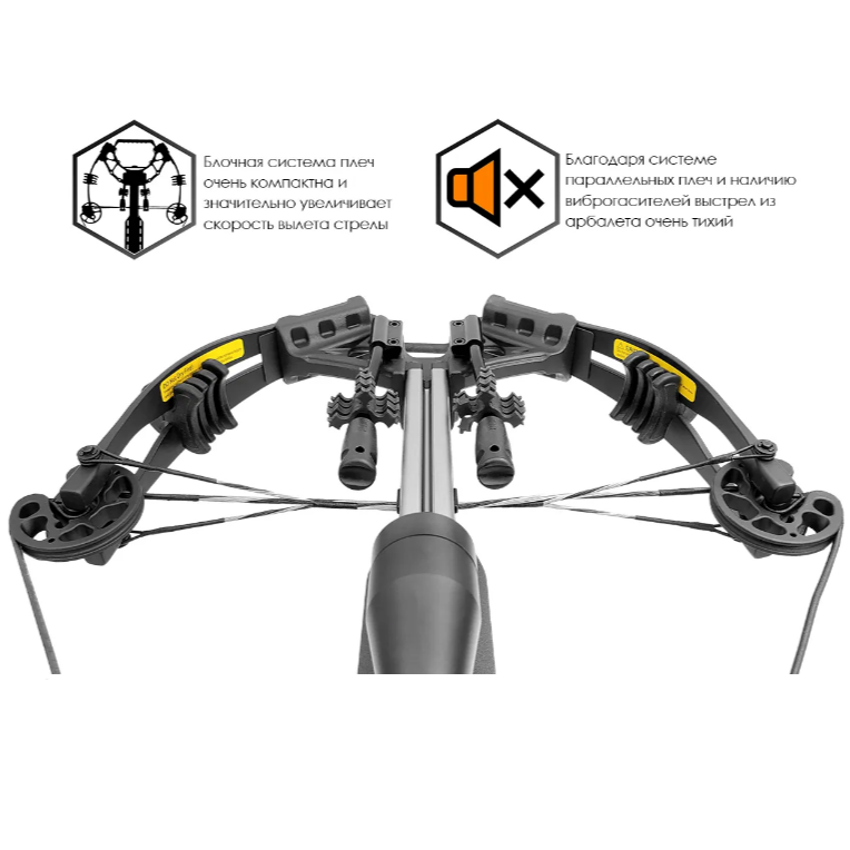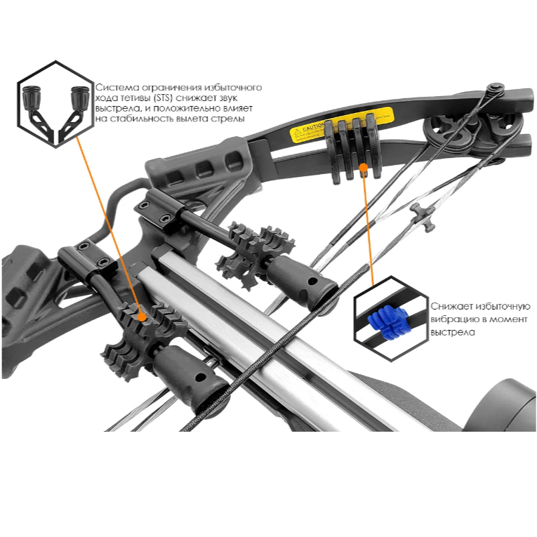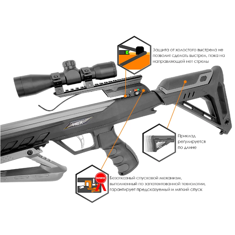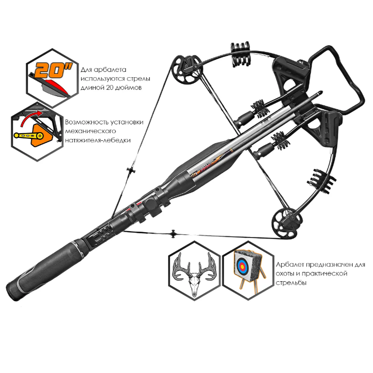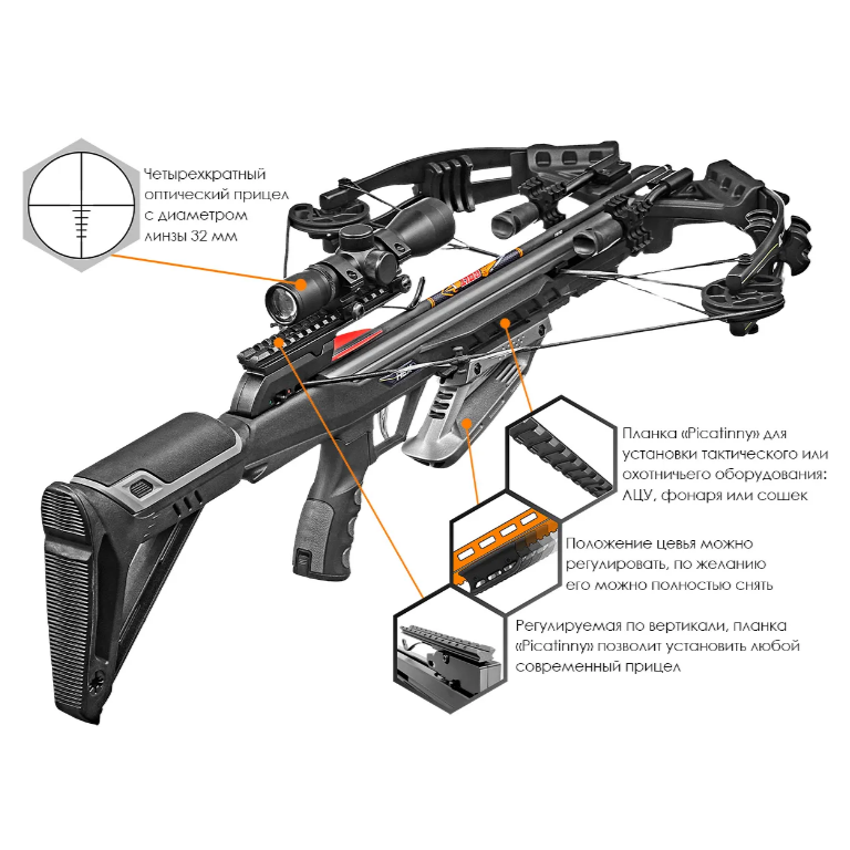 Арбалет комплектуется прикладом тактического типа с регулировкой длины. Опционально на приклад можно установить механический натяжитель тетивы, который упрощает процесс взведения арбалета и будет незаменим при использовании в условиях ограниченной подвижности стрелка (например, сидя на лабазе).