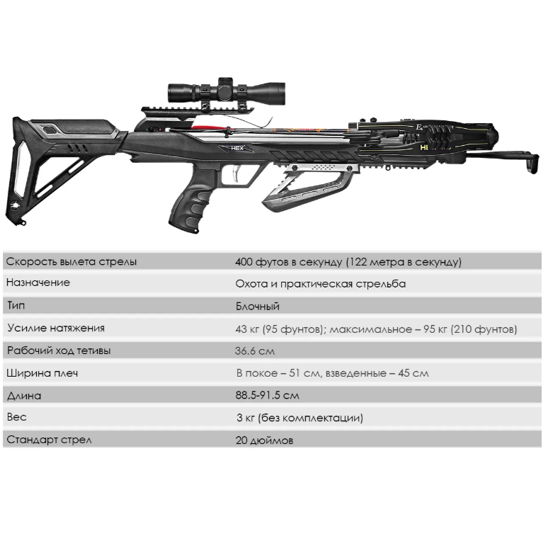 Блочный охотничий арбалет HEX-400 – новинка 2021 года от компании Ek Archery. Арбалет демонстрирует высокую (400fps) скорость вылета стрелы и заимствует наиболее удачные конструктивные решения от уже известных моделей этой же серии (Accelerator 410 и Blade Plus).