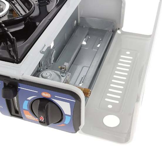 Плита оборудована одной горелкой с круговым образованием пламени, имеет пьезоэлектрический розжиг и блок управления подачей газа. Поставляется в пластиковом чемодане (кейсе), который предназначен для транспортировки и хранения плиты.