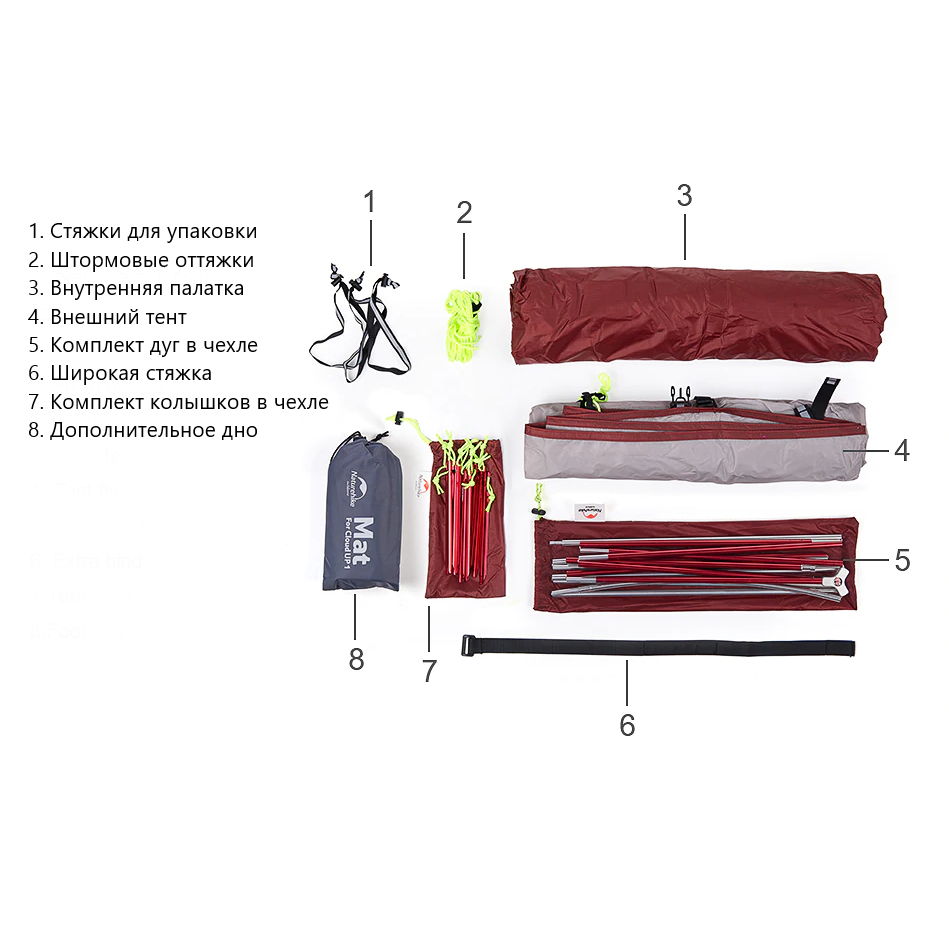 Каркас изготовлен из очень прочного, но гибкого легированного алюминия марки 7001. Основное достоинство этого сплава в том, что он практически не подвержен остаточной деформации. Это значит, что после сборки палатки все элементы снова приобретают первоначальную прямую форму.