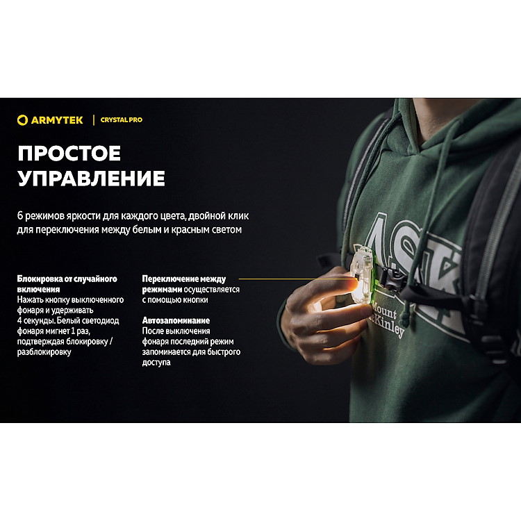 Велосипедный стоп-сигнал — это новая функция компактного мультифонаря Armytek, существенно расширяющая сферы применения. Специально для использования в качестве стоп-сигнала Crystal Pro оборудован встроенным 3D акселерометром. Высокочувствительные датчики фиксируют торможение велосипеда, после чего включаются дополнительные красные светодиоды и яркость фонаря увеличивается до 43 люмен.