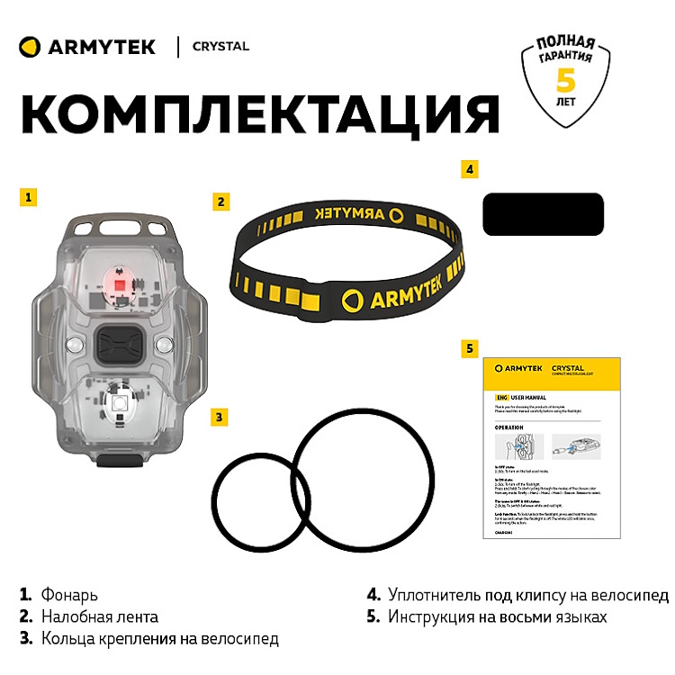 Модель надежно фиксируется на голове с помощью эластичной ленты и позволяет заниматься любым делом при хорошем освещении. Фонарь может быть закреплен на любом элементе одежды, ремне или шлейке рюкзака для безопасных пеших прогулок в ночное время суток. С помощью специальных силиконовых колец в комплекте Crystal прочно крепится на велосипед, а конструкция корпуса с отверстием под кольцо для ключей позволяет использовать мультифонарь в качестве стильного аксессуара.