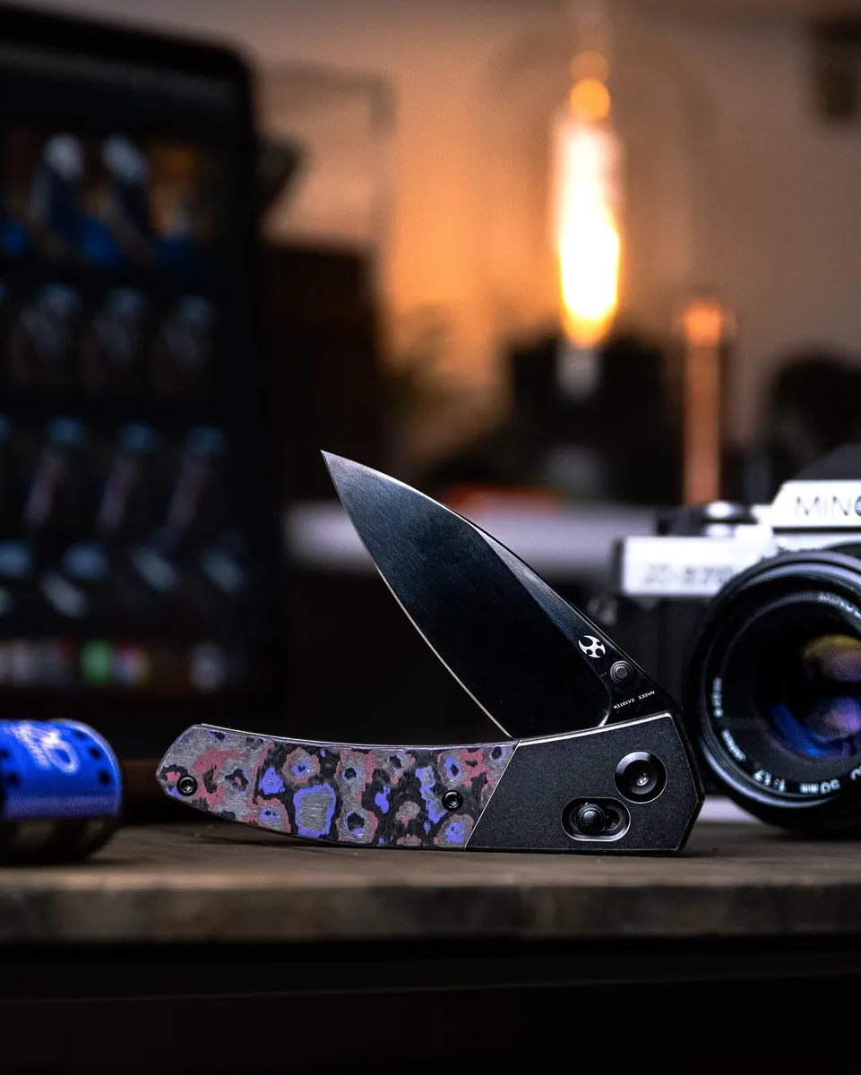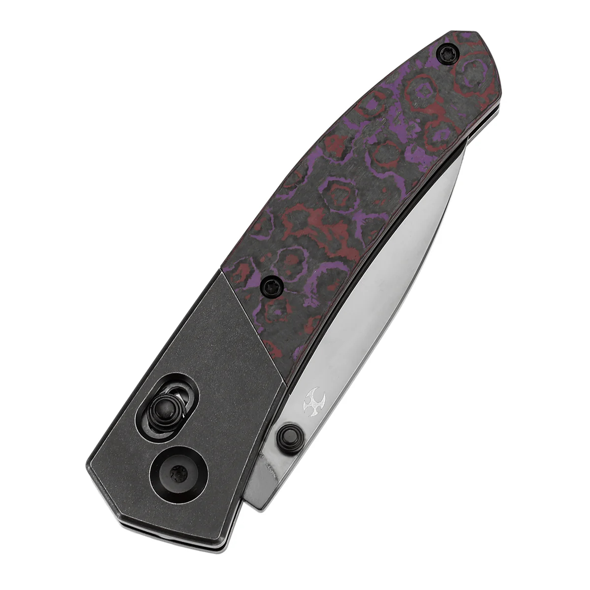 Рукоять изготовлена из комбинации титана и карбона/углеродного волокна/тимаска/микарты, что обеспечивает прочность и привлекательный внешний вид. Рукоять имеет небольшой изгиб, который естественным образом повторяет контуры руки, а скошенные края обеспечивают плавный и удобный захват.