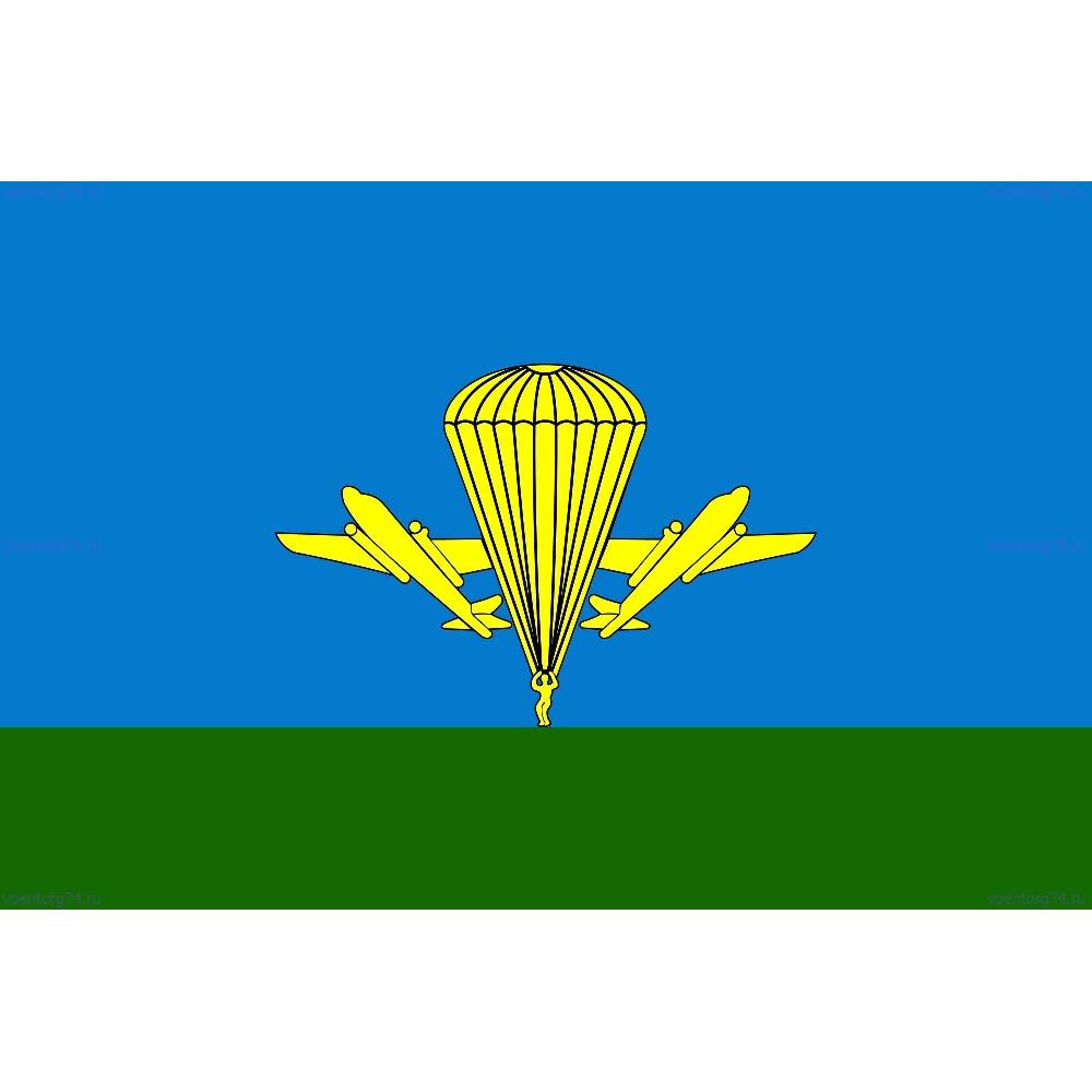 Флаг Воздушно-десантных войск представляет собой прямоугольное двухстороннее полотнище голубого цвета с зеленой полосой в нижней части. В центре полотнища -изображение золотого раскрытого парашюта с фигурой парашютиста и двух самолетов с обеих сторон парашюта (далее именуется -изображение). Отношение ширины флага к его длине 2:3.