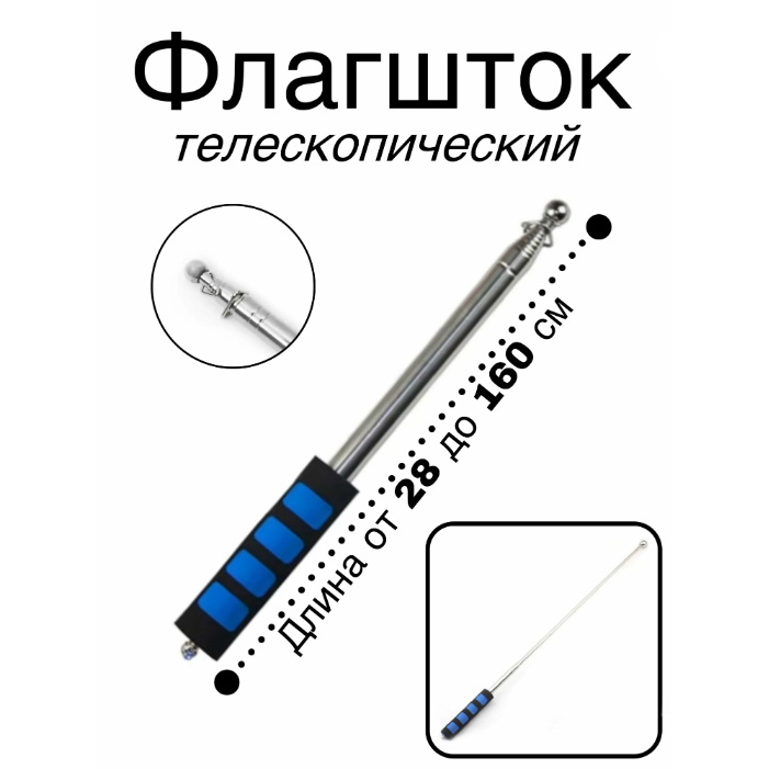 телескопический флагшток длиной от 28 до 160см с рукоятью из неопрена с двумя кольцами для крепления флага по краям