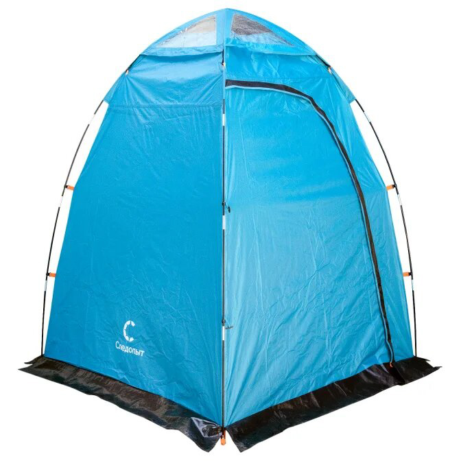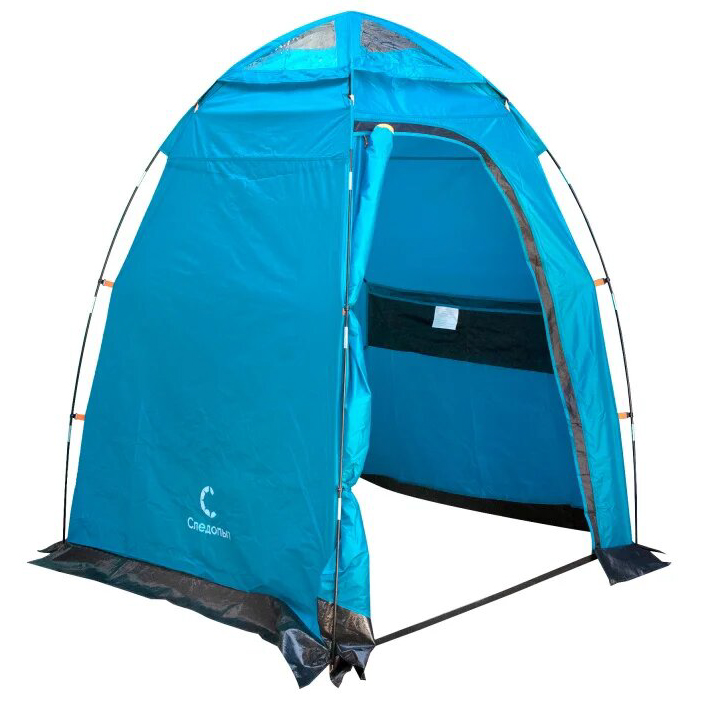 Палатка душ-туалет "Следопыт" может использоваться как душ, туалет, раздевалка или для хранения снаряжения и запасов в походных условиях. Высота 2 м позволяет комфортно находиться внутри высокому человеку. Четыре вентиляционных отверстия в куполе закрываются прозрачной дождевой накидкой. Для лучшей вентиляции в сухую погоду дождевую накидку можно снять. Внутри палатки имеется стропа для полотенец и одежды, а также большой карман для хранения вещей. Удлиненные оттяжки - 2,5 м, позволяют легко крепить палатку к деревьям или земле. Поставляется в сумке-чехле с длинной ручкой.