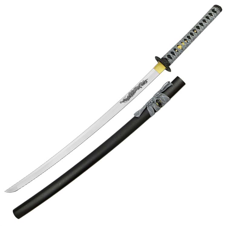 Стильный изящный меч, сделанный в традиционном японском стиле. Длинный клинок выполнен из конструкционной стали. Меч декорирован в сдержанных тёмных тонах с рисунком на клинке. Это сувенирное изделие, не предназначенное для реальной эксплуатации