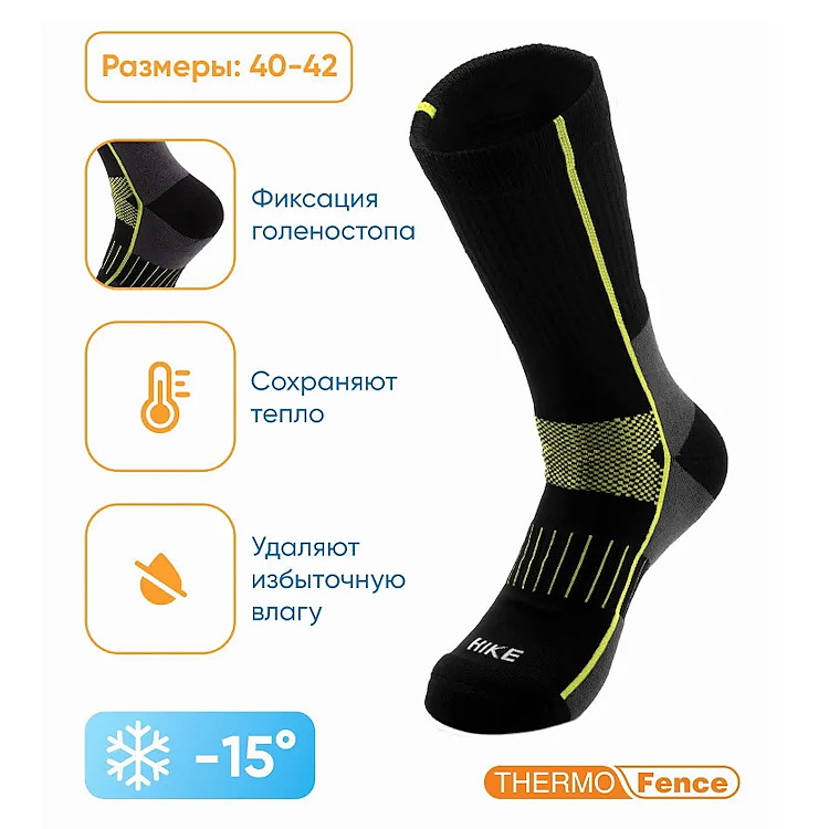 Термоноски «Сибирский Следопыт Hike ThermoFence» - подходят для людей, занимающимся трекингом, а также активной охотой. Высокотехнологичное полотно ThermoFence состоит из переплетенных пустотелых волокон специальной формы и в зимний период позволяет сохранить ноги в тепле, а в летний зной охладить. За счет тонкого плетения в районе стопы происходит удаление избыточной влаги. Внутреннее ворсистое полотно обеспечивает удобство при ношении жесткой обуви. Рекомендованный температурный режим -15 С.
