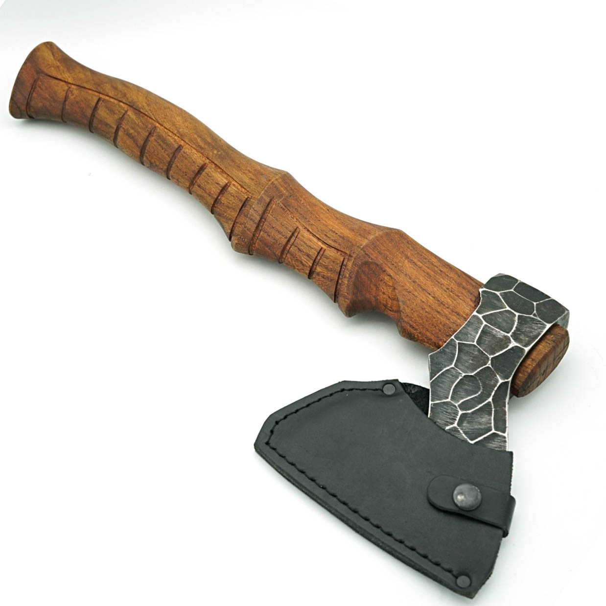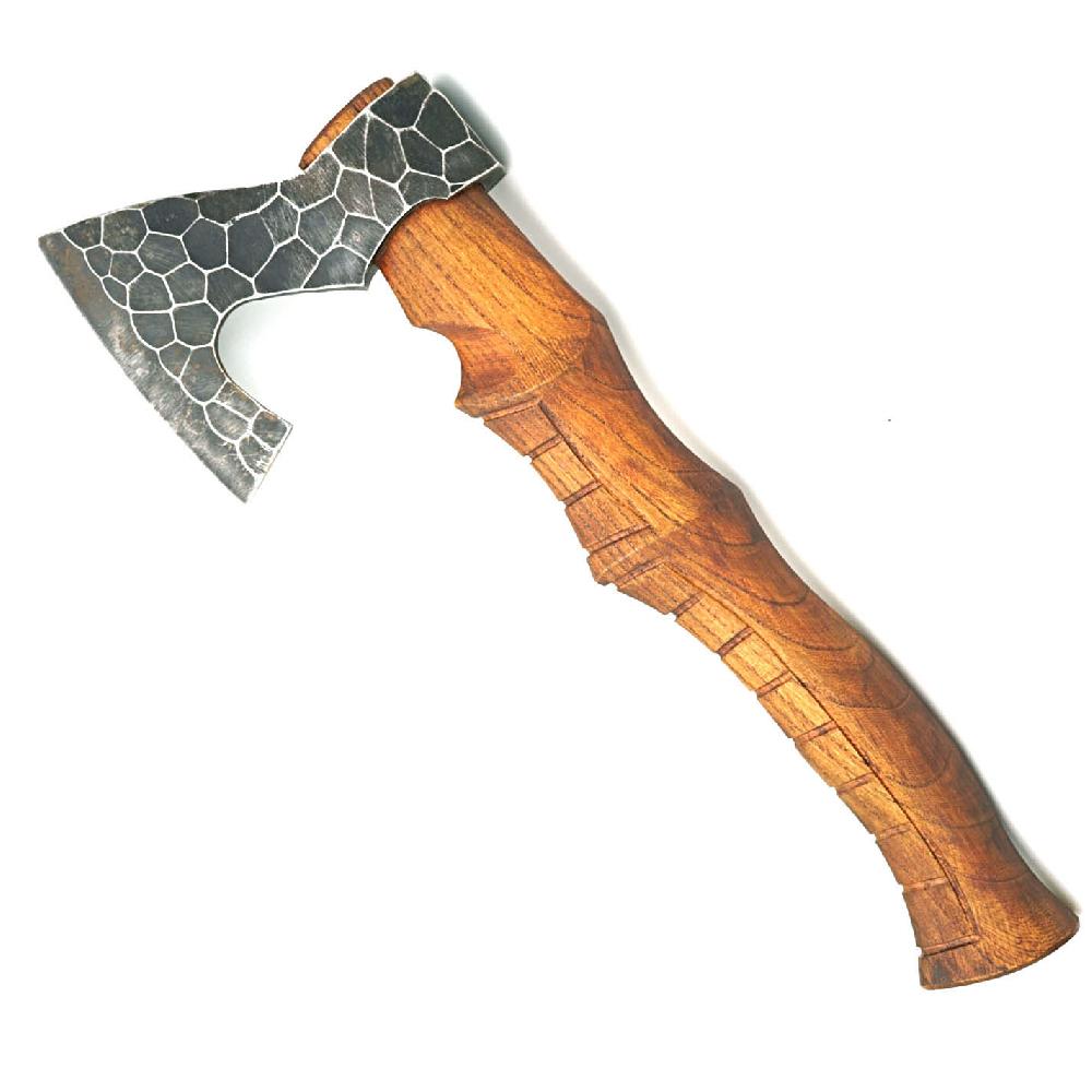 Топор изготовлен из стали 9ХС и резной рукояти из твердой породы древесины Масса топора 1055г, Длина рукояти 35,5см. Высота топорища 17см, длина режущей части 13,5см
