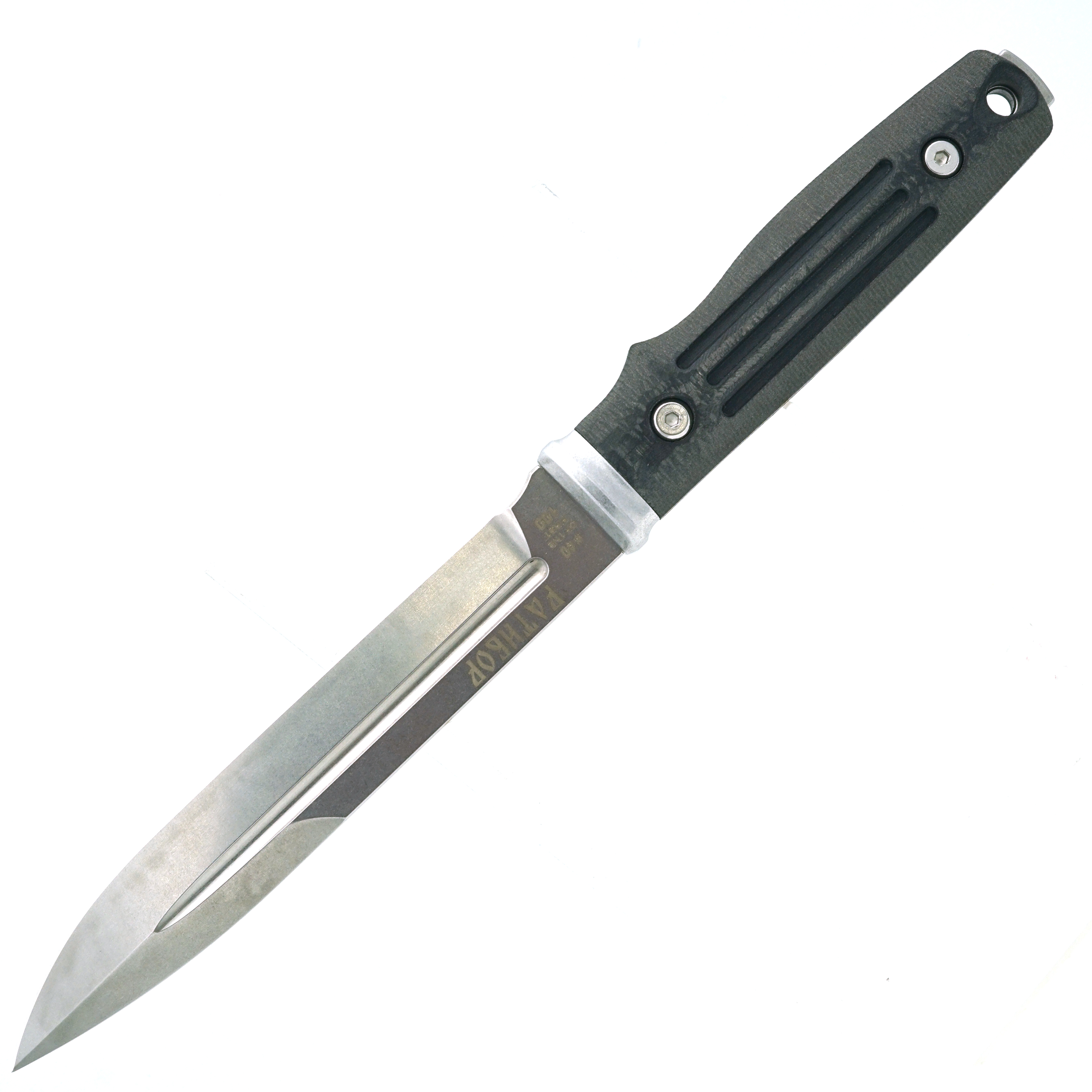 Нож "РАТИБОР" - мощный нож, имеющим копьевидный клинок длинной 160 мм. с долом. Фальшлезвие имеет тонкое сведение и при необходимости может быть дополнительно заточено.